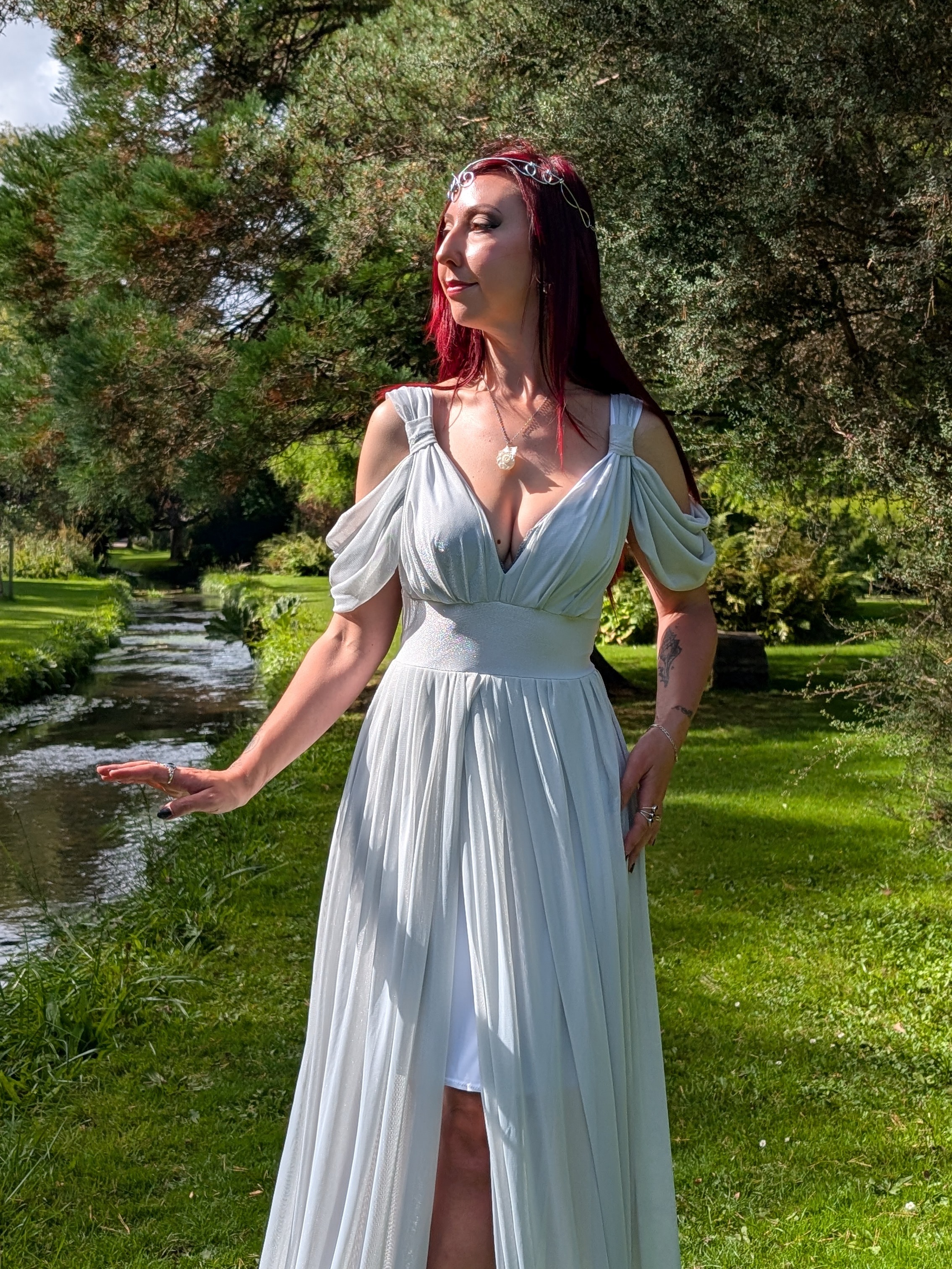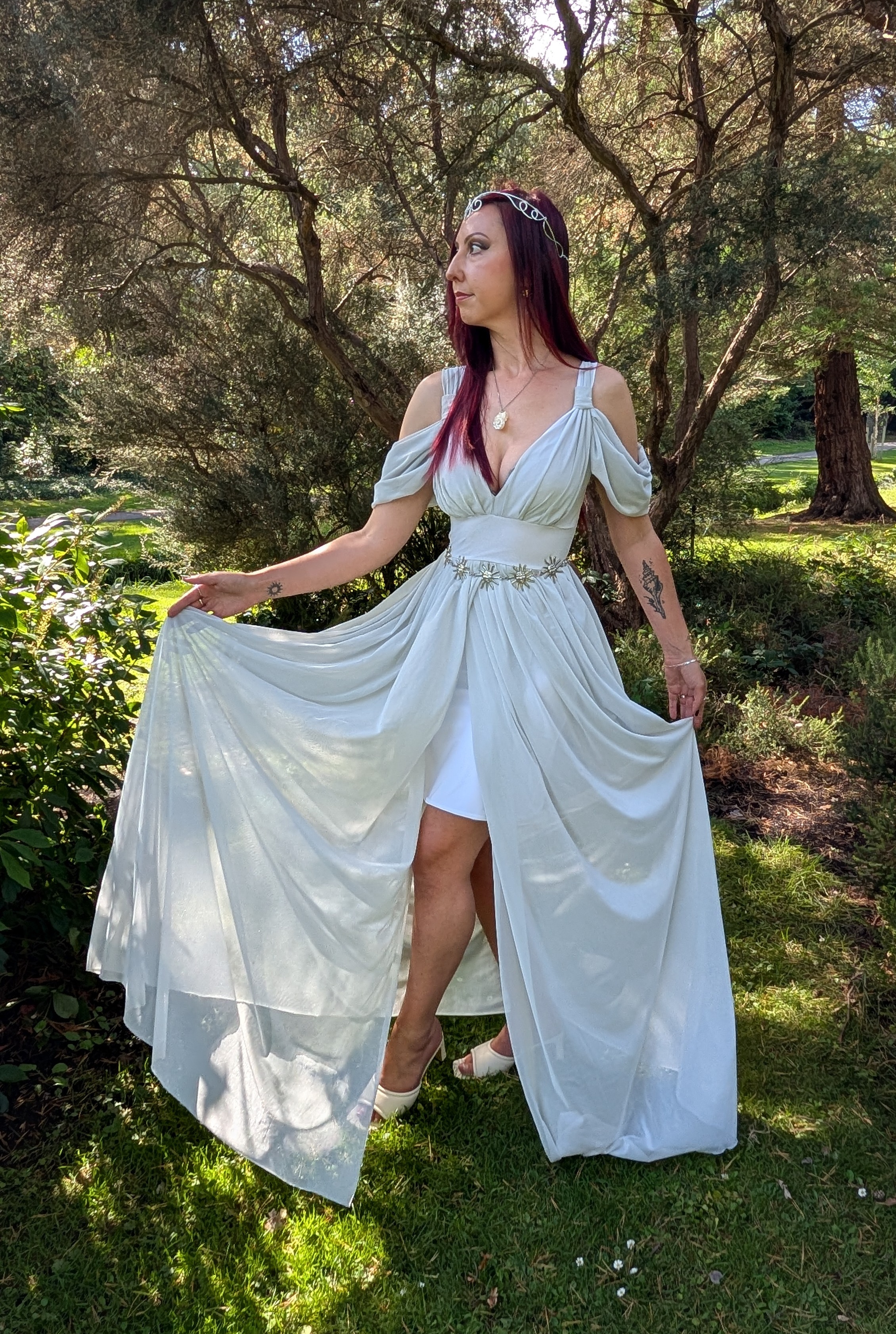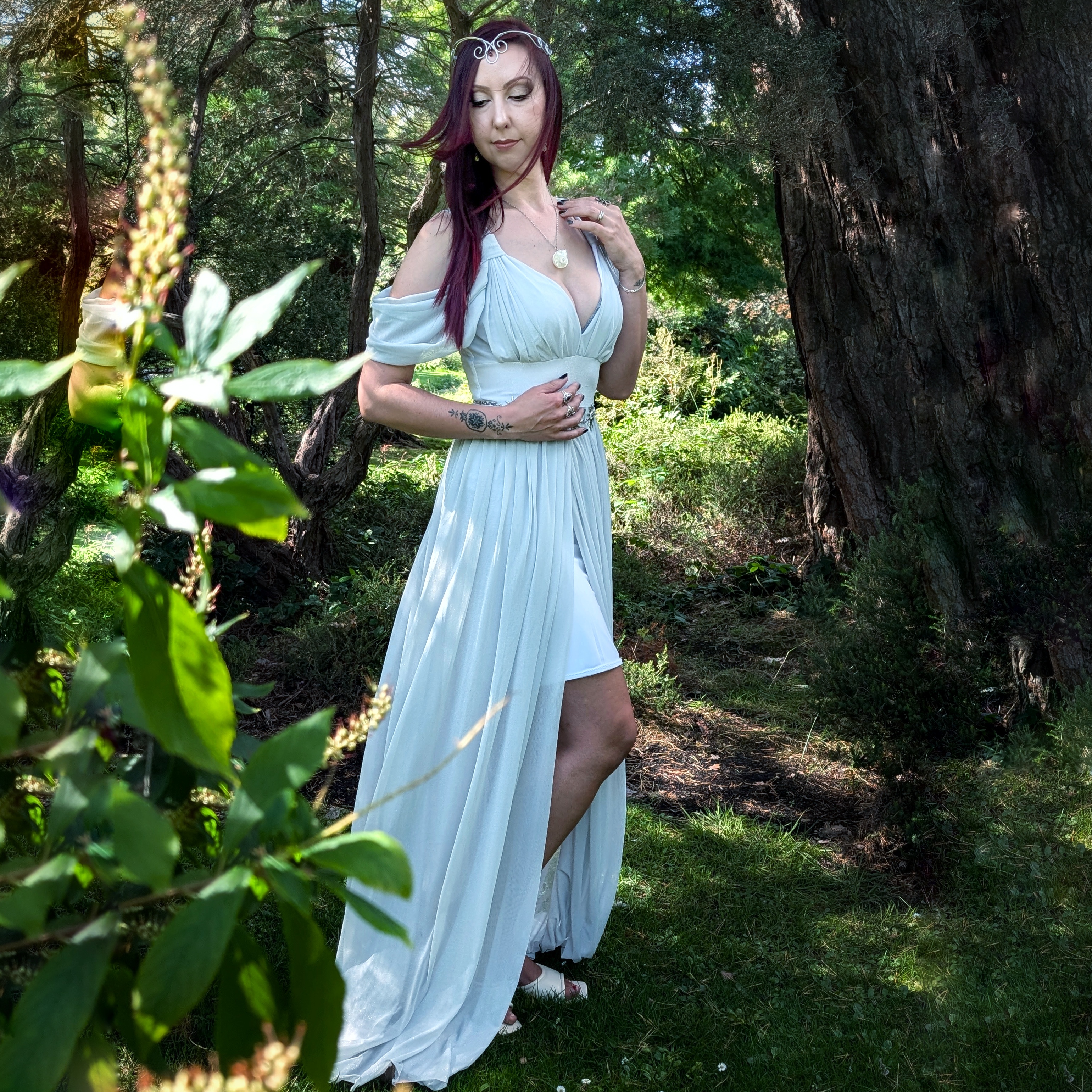Grecian style maxi dress with front split and off shoulder detailing. Elven princess or Goddess, this is certainly a dress for ethereal beings.