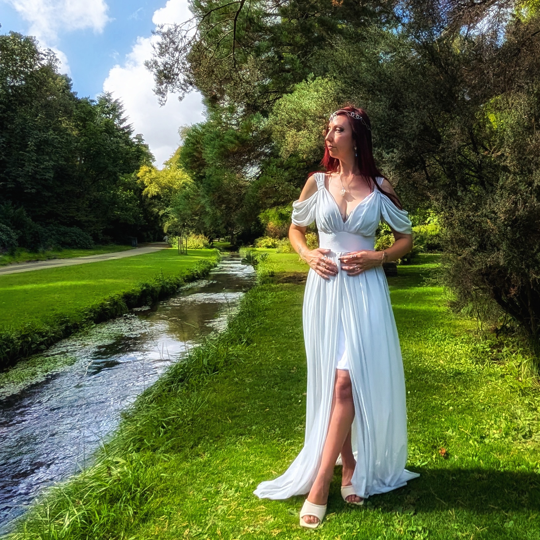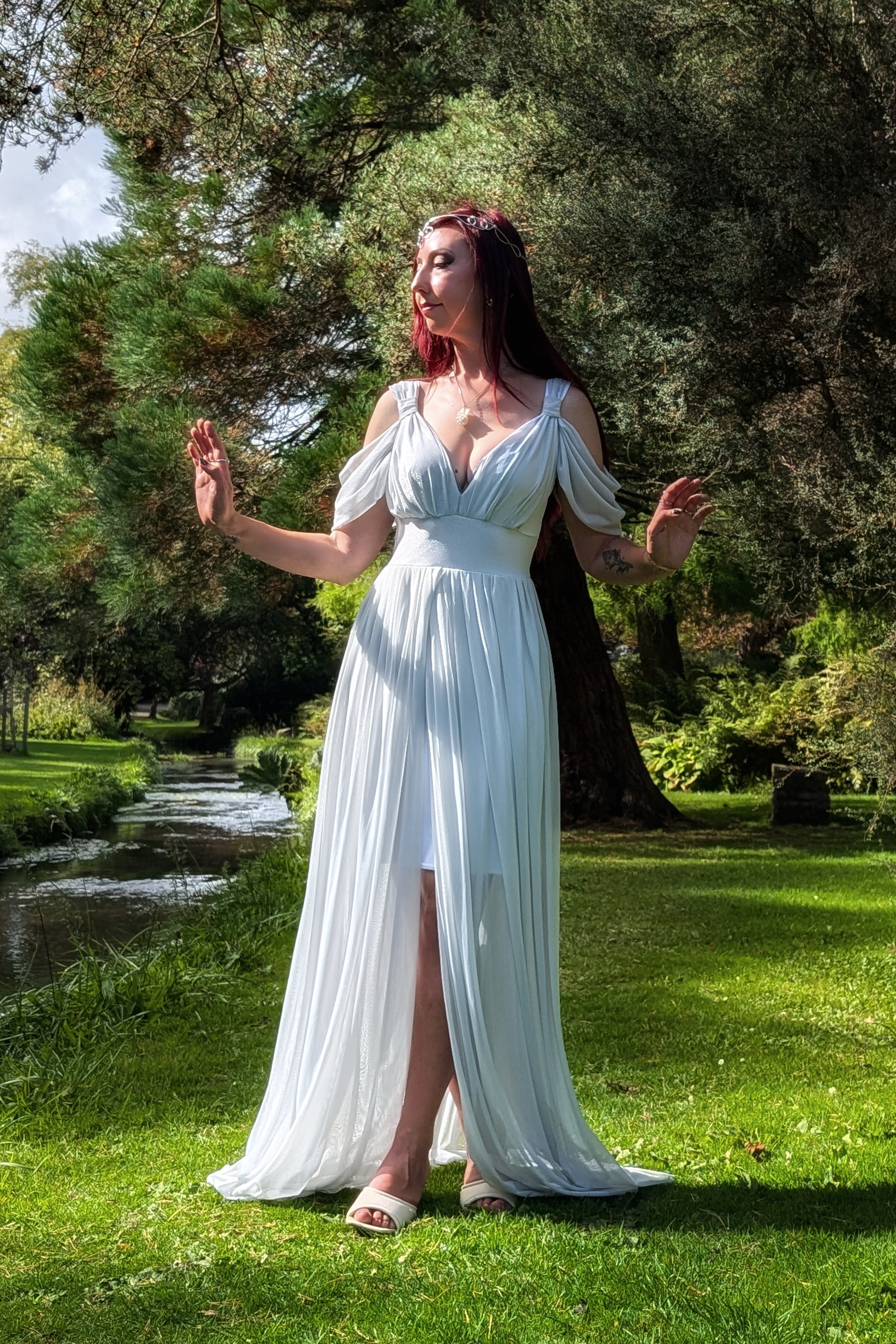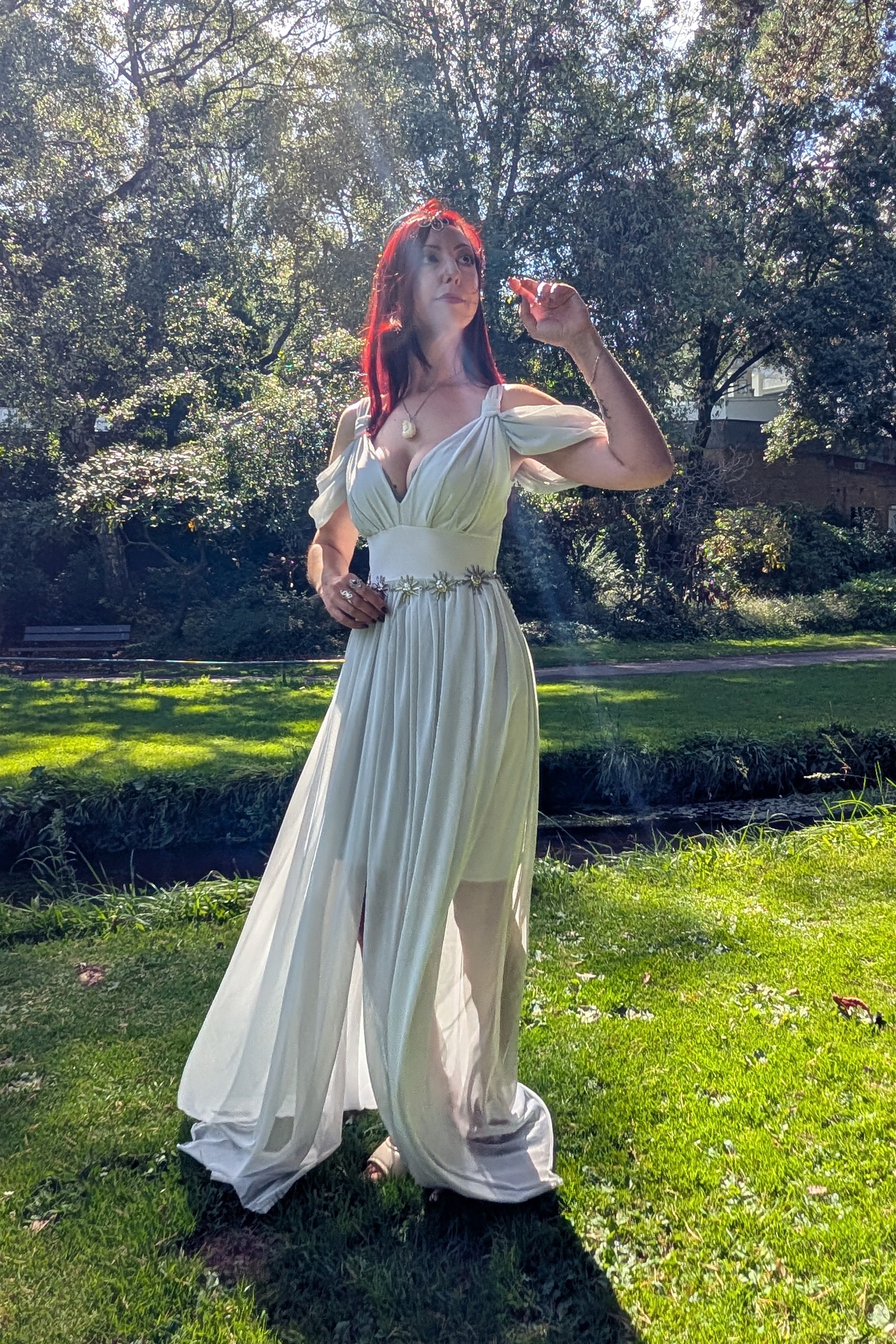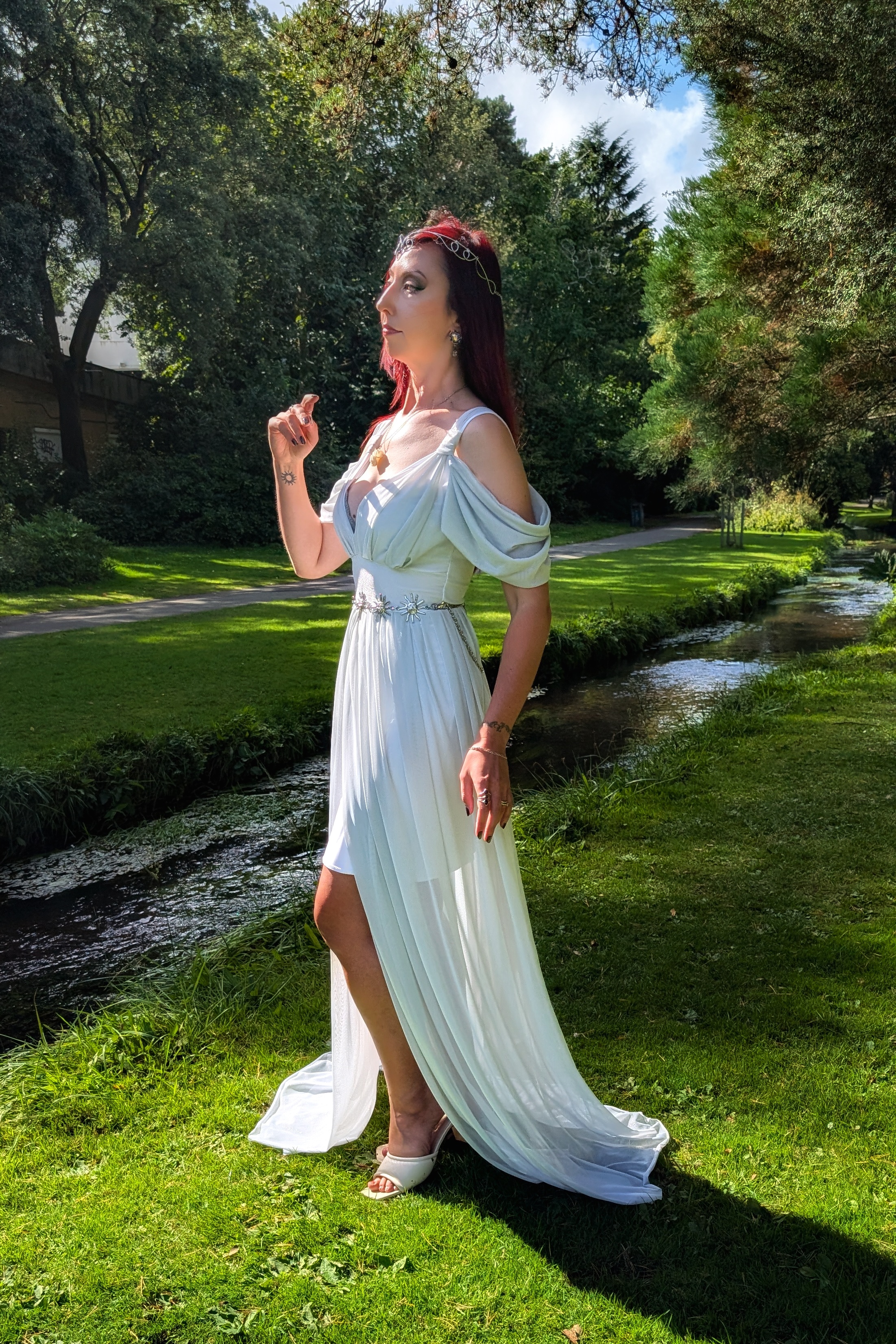 Grecian style maxi dress with front split and off shoulder detailing. Elven princess or Goddess, this is certainly a dress for ethereal beings.